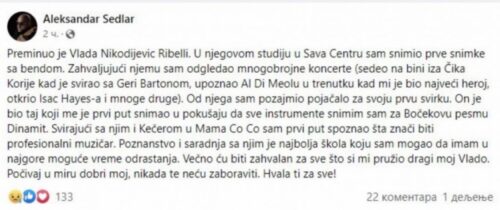 – Preminuo je Vlada Nikodijevic Ribelli. U njegovom studiju u Sava Centru sam snimio prve snimke sa bendom. Zahvaljujući njemu sam odgledao mnogobrojne koncerte (sedeo na bini iza Čika Korije kad je svirao sa Geri Bartonom, upoznao Al Di Meolu u trenutku kad mi je bio najveći heroj, otkrio Isac Hayes-a i mnoge druge). Od njega sam pozajmio pojačalo za svoju prvu svirku. On je bio taj koji me je prvi put snimao u pokušaju da sve instrumente snimim sam za Bočekovu pesmu Dinamit – stoji u objavi na društvenoj mreži Fejsbuk.