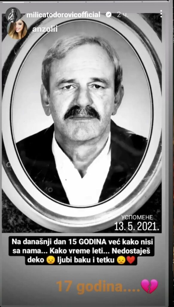 Objavila je fotografiju svog dede sa tekstom „Na danasnji dan 15.godina vec kako nisi sa nama… Kako vreme leti… Nedostajes, deko. Ljubi baku i tetku„.