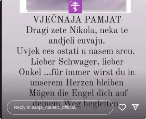 – Večnaja pamjat! Dragi zete Nikola, neka te anđeli čuvaju. Uvek ćeš ostati u našem srcu – napisala je Sanja.