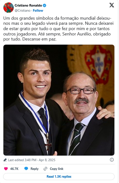– Jedan od najvećih simbola svetskog fudbala nas je napustio, ali njegovo nasleđe će živeti zauvek. Zauvek ću biti zahvalan za sve što si učinio za mene i toliko drugih igrača. Zbogom, gosopodine Aurelio, hvala na svemu. Počivaj u miru – oglasio se Kristijano koji nikada neće zaboraviti svog mentora na početku blistave karijere.