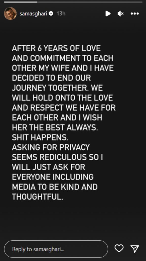 – Nakon šest godina ljubavi i posvećenosti, supruga i ja smo odlučili da okončamo svoje zajedničko putovanje. Uvek ćemo čuvati ljubav i poštovanje, i uvek ću joj želeti sve najbolje. S*anja se dešavaju – napisao je Asgari.