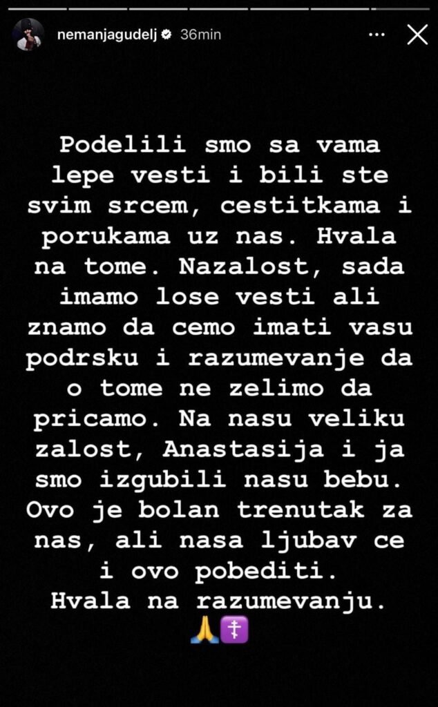 Nažalost, Nemanja je na svom Instagram nalogu objavio jako tužnu vest da je trudnoća prekinuta i da je pevačica izgubila bebu.