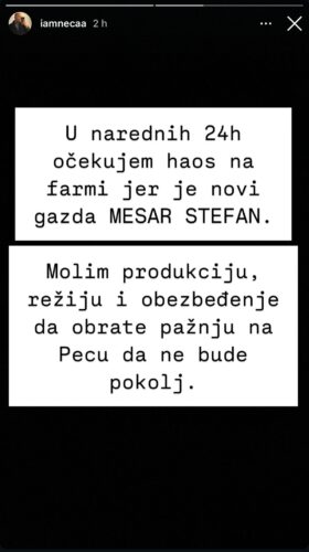 – U narednih 24 časa očekujem haos jer je novi gazda MESAR STEFAN. Molim produkciju, režiju i obezbeđenje da obrate pažnju na Pecu da ne bude pokolj – napisao je Neca u svojoj javnoj objavi.