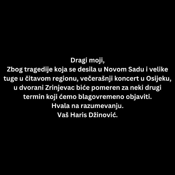 – Kao otac, građanin i čovek duboko sam potresen tragedijom koja se dogodila u Novom Sadu i saosećam sa stradalima i njihovim porodicama. Smatram da nije vreme za koncerte u trenutku nacionalne tragedije ovih razmera i zato sam odlučio da otkažem koncert u Osijeku kome sam se iskreno radovao. Nadam se da će ovo naići na razumevanje organizatora, ali pre svega svih vas koji ste kupili karte i koji ste želeli da večeras uživate u mojim pesmama. Moja želja je da do našeg druženja dođe kada bude bilo neko lepše vreme za pevanje, a o svim detaljima ćete biti blagovremeno obavešteni. Verujem da razumete zašto danas nisam u stanju da vam pevam i na tome vam se unapred zahvaljujem – rekao je Džinović.