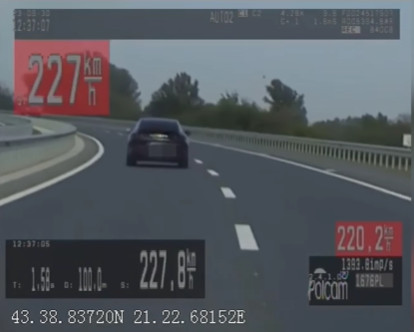 Policijski službenici Uprave saobraćajne policije presretačem su zaustavili tridesetčetvorogodišnjeg vozača vozila „porše panamera“, koji se na autoputu Kruševac – Pojate, u Varvarinu, kretao brzinom od 227,8 kilometara na čas, na delu puta gde je ograničenje brzine 130 kilometara na čas.