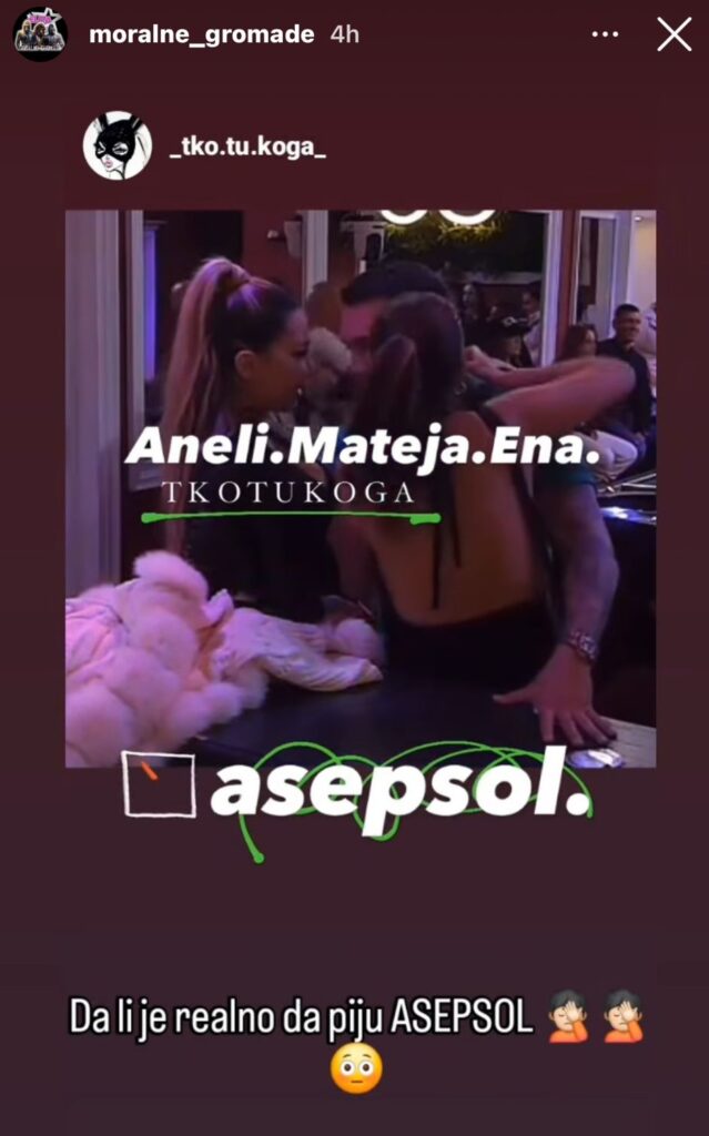 – Rekao mi je: „Rekli su nam da vam oduzmemo asepsol koji pijete“. Aneli kaže: „Mi ne pijemo asepsol“. Kaže on: „Odmah mi dajte tu čašu“. Sofija mi je stavila u kaput tu šolju i mi prosipamo u cveće i kaže ona: „Sutra u novinama naslov dve majke piju asepsol“ – rekla je Ena kroz smeh.