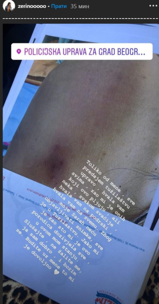– Šminkerka je videla modricu ispod mog oka, kad smo snimali spot, ali ona je prikrila. To je prvi napad. On je imao nastup, ja sam došla, on je napravio ljubomornu scenu, ja sam napustila nastup, uzela sam taksi i otiša u naš stan, a on je ostao da nastupa. Došao je kući i to se desilo. Bio je pijan, ja nisam znala da konzumira narkotike, ja sam mu ispričala šta se desilo. On se izobličio, bacio me je na pod i udario mi je šamar. – rekla je Zerina za Kurir.