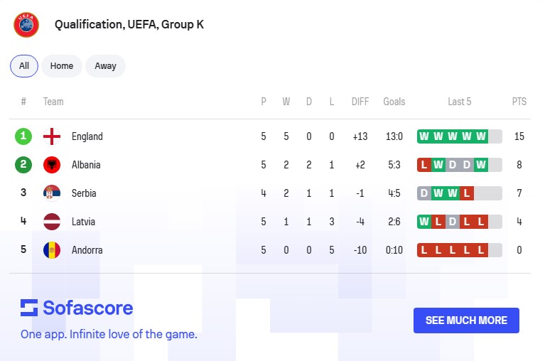 Srbija je trenutno na trećem mestu tabele sa četiri boda, Albanci su drugi sa pet, ali i utakmicom više. Gordi Albion je maksimalan sa svih pet pobeda na liderskoj poziciji.