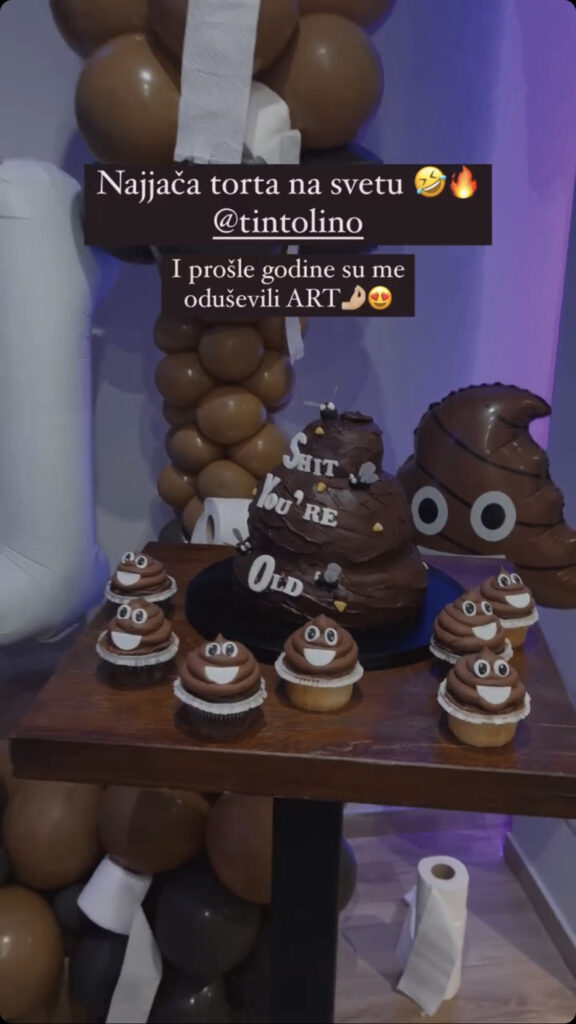 U svom prepoznatljivom stilu, dekoraciju su predstavljali toalet papiri, baloni u obliku izmeta, kao i torta sa „muvama“ po sebi. Slavljenica se pobrinula i za koktele u špricevima, a na sred prostorije nalazio se