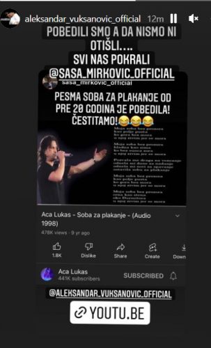 Zatim se na svom Instagram nalogu oglasio i pevač Aca Lukas uz poruku: