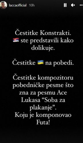 -Čestitke kompozitoru pobedničke pesme što zna pesmu Ace Lukasa, „Soba za plakanje“ koju je komponovao Futa – napisao je Laća.