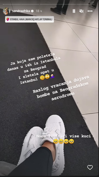 – Ja koja sam poletela danas u 14h iz Istanbula za Beograd i sletela opet u Istanbul, razlog vraćanja je dojava bombe na beogradskom aerodromu. Hoću li stići više kući- objavila je pevačica na svom Instagram profilu.