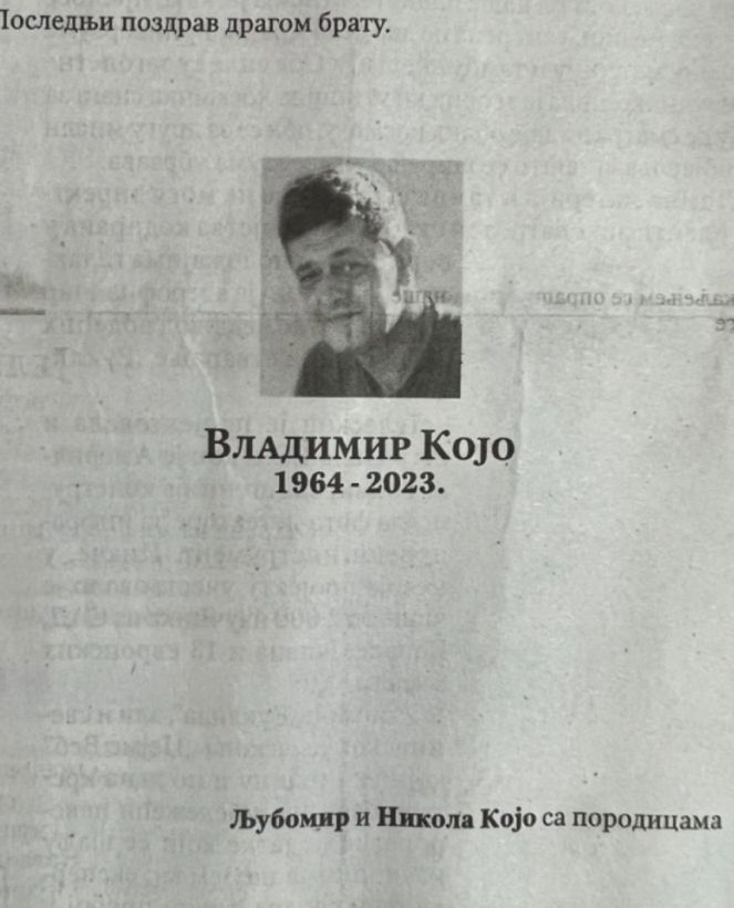 Vladimir Kojo, brat glumca Nikole Koja preminuo je u 59. godini.Čitulju bratu su dali Ljubomir i Nikola Kojo sa porodicama.