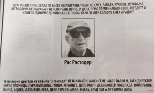 U današnjem izdanju „Večernjih Novosti“, osvanula je čitulja posvećena glumcu, koju su, između ostalih prijatelja iz kafića u koji je odlazio, i „Bred Pit i Anđelina Džoli“.