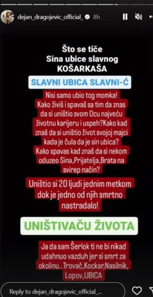 – Što se tiče sina ubice slavnog košarkaša. Nisi ga samo ubio. Kako živiš s tim da znaš da si uništio svom ocu životnu karijeru i uspeh? Kako kad znaš da si uništio život svojoj majci kada je čula da joj je sin ubica? Kako spavaš kad znaš da si nekom oduzeo sina, prijatelja, brata na svirep način? Uništio si dvadeset ljudi jednim metkom, dok je jedno od njih smrtno nastradalo. Ja da sam Šerlok ti ne bi nikad udahnuo vazduh jer si smrt za okolinu: trovač, kockar, nasilnik, lopov, ubica – napisao je Dejan.