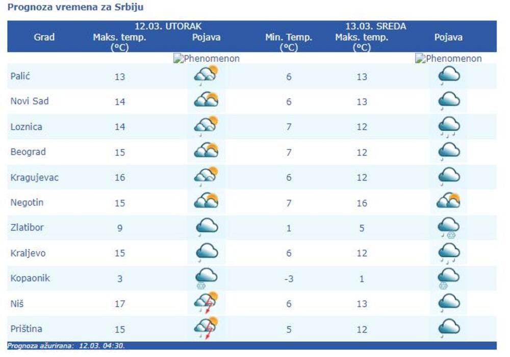 Petak – Promenljivo oblačno i toplije. U većini krajeva biće suvo, a slabe kratkotrajne padavine očekuju se tek ponegde u brdsko-planinskim predelima južne i istočne Srbije. Vetar slab severozapadni, uveče u skretanju na jugoistočni. Najniža temperatura od 3 do 7, najviša od 14 do 18 stepeni.