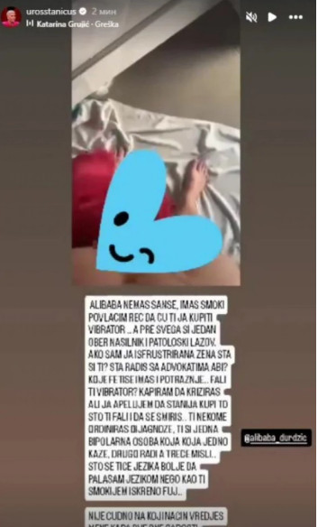 – Alibaba, nemaš šanse, imaš smoki. Povlačim reč da ću ti ja kupiti vib*ator… A pre svega si jedan ober nasilnik i patološki lažov! Ako sam ja isfrustrirana žena, šta si ti?! Šta radiš sa advokatima? Koje fetiše imaš i potražnje? Fali ti vib*ator? Kapiram da kriziraš, ali ja apelujem da Stanija kupi to što ti fali, da se smiriš… – napisao je Uroš i dodao: