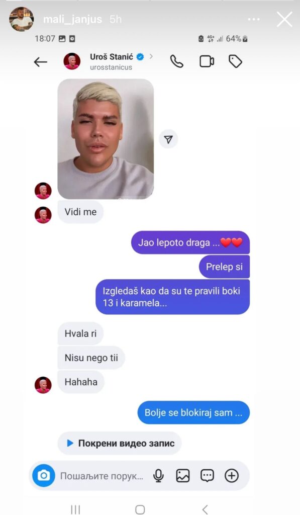 Čini se da je sada Uroš želeo da isprovocira bivšeg druga, pa mu je poslao poruke. Naime, slikavši selfi koji je poslao Janjušu, Stanić je čekao odgovor, uz poruku: „Vidi me“.