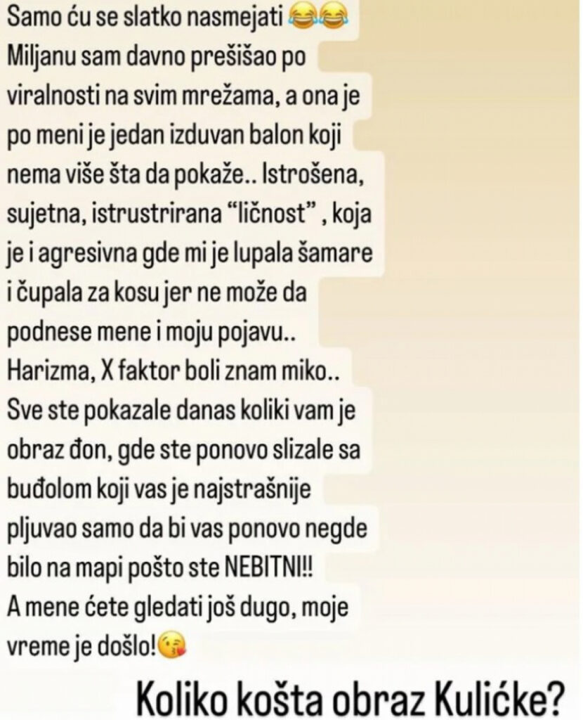 Miljanin rival žestoko je potkačio porodicu Kulić putem storija na Instagramu.