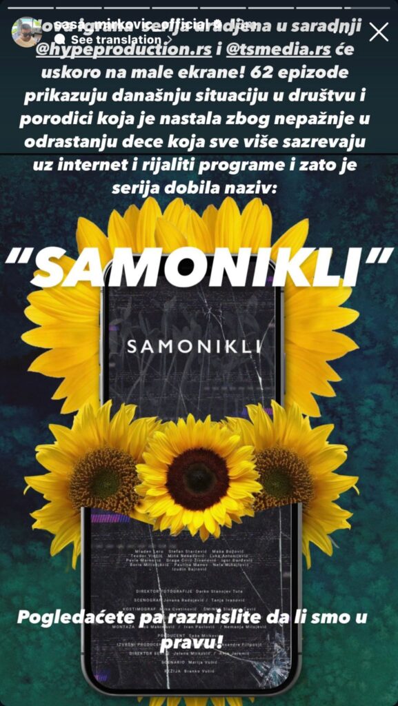 -Nova igrana serija urađena u saradnji Hype production i TS Media će uskoro na male ekrane! 62 epizode prikazuju današnju situaciju u društvu i porodici koja je nestala zbog nepažnje u odrastanju dece koja sve više sazrevaju uz internet i rijaliti programe i zato je serija dobila naziv: „SAMONIKLI“. Pogledaćete pa razmislite da li smo u pravu! – napisao je Mirković na svom Instagram nalogu.