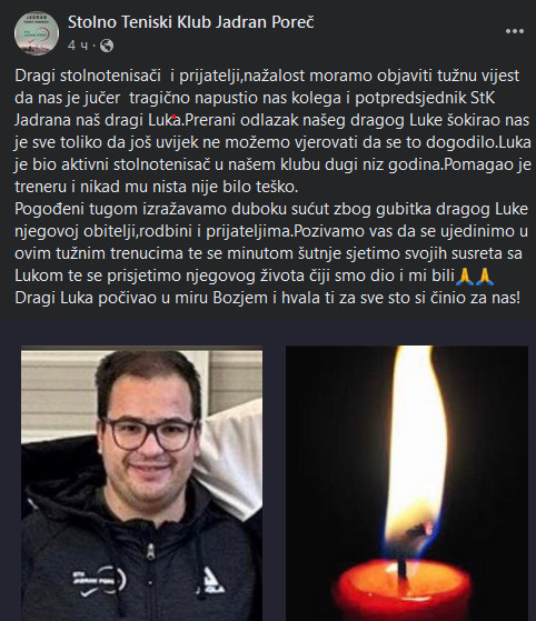 – Dragi stonoteniseri i prijatelji, nažalost moramo objaviti tužnu vest da nas je juče tragično napustio nas kolega i potpredsednik STK Jadrana naš dragi Luka. Prerani odlazak našeg dragog Luke šokirao nas je sve toliko da još uvek ne možemo verovati da se to dogodilo. Luka je bio aktivni stonoteniser u našem klubu dugi niz godina. Pomagao je treneru i nikad mu ništa nije bilo teško.