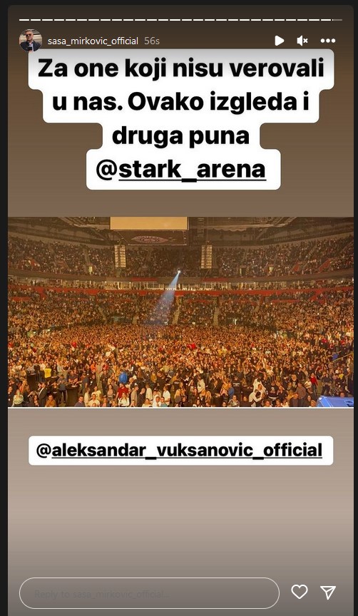 Menadžer i vlasnik “Hajp produkcije” Saša Mirković, atmosferu u Štark Areni prokomentarisao je na svom Instagram storiju, rečima: „ZA ONE KOJI NISU VEROVALI U NAS, OVAKO IZGLEDA DRUGA PUNA ŠTARK ARENA!