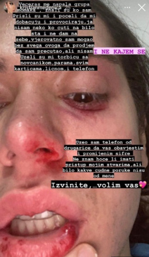 Kristian je podelio svoju sliku na kojoj je pretučen i ima ozbiljne povrede na licu, uz objašnjenje šta se desilo. Kako je naveo, njega su napala i opljačkala trojica mladića.