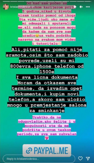 – Od kad sam počeo sa šminkerskom karijerom pre pet godina, nikad u životu nisam tražio pomoć ni od koga. Šta više, ljudi oko mene su mi odmagali i sputavali me, ali sada sa ponosom mogu da kažem da sam sve sam uradio. Uz vašu podršku naravno na svakom mom videu i tutorijalu. Ali, pitati za pomoć nije sramota. Osim što sam zadobio povrede, uzeli su mi 800 evra, Iphone telefon od 1500 evra, i sva lična dokumenta. Moram da otkažem sve termine, da izvadim ponovo dokumenta, kupim novi telefon, a skoro sam uložio mnogo u premeštanje salona za šminkanje. Ukratko, ako želite i u mogućnosti ste da me podržite u ovom teškom periodu, za sve sam zahvalan – napisao je ovaj mladić i u prilog stavio popularno platformu za uplaćivanje donacija na račun.