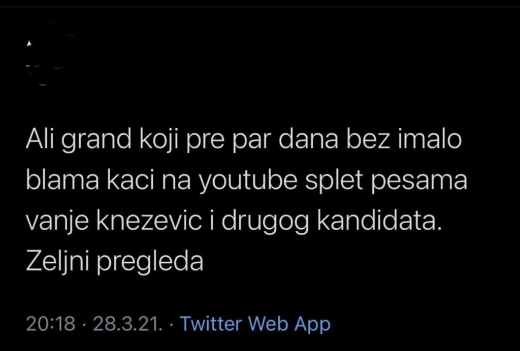 – Ali Grand koji pre par dana bez malo blama kači na Jutjub splet pesama Vanje Knežević i drugog kandidata. Željni pregleda – glasio je komentar jednog revoltiranog tviteraša.