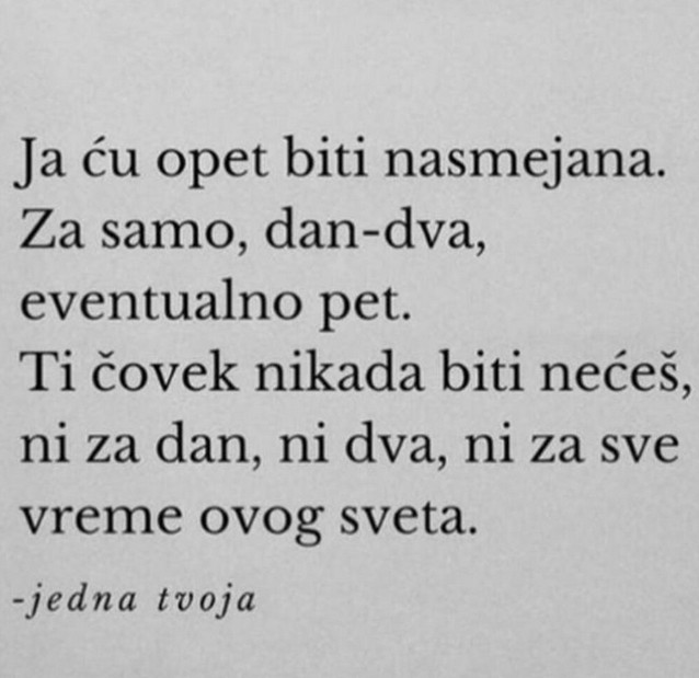 – Ja ću opet biti nasmejana. Za samo dan-dva, eventualno pet. Ti čovek nikada nećeš biti, ni za dan, ni za dva, ni za sve vreme ovog sveta – poručila je Vanja.