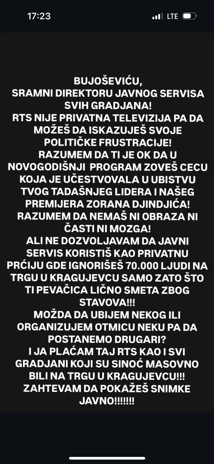 “Bujosevicu, sramni direktoru javnog servisa svih gradjana! RTS nije privatna televizija pa da mozes da iskazujes svoje politicke frustracije! Razumem da ti je ok da u novogodisnji program zoves Cecu, koja je ucestvovala u ubistvu tvog tadasnjeg lidera I naseg premijera Zorana Đinđića! Razumem da nemas ni obraza ni casti ni mozga! Ali ne dozvoljavam da javni servis koristis kao privatnu prćiju gde ignorises 70.000 ljudi na Trgu u Kragujevcu samo zato sto ti pevacica licno smeta zbog stavova! Mozda da ubijem nekog ili organizujem otmicu neku, pa da postanemo drugari? I ja placam taj RTS kao I svi gradjani koji su sinoc masovno bili na Trgu u Kragujevcu!