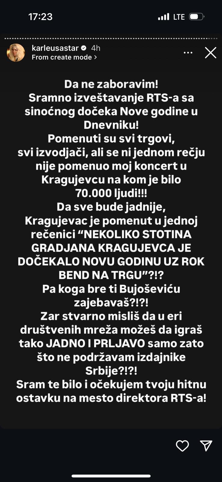 sinoćnog doceka Nove godine u Dnevniku! Pomenuti su svi trgovi, svi izvodjaci, ali se ni jednom nije pomenuo moj koncert u Kragujevcu na kom je bilo 70.000 ljudi!!! Da sve bude jadnije, Kragujevac je pomenut u jednoj recenici „NEKOLIKO STOTINA GRADJANA KRAGUJEVCA JE DOCEKALO NOVU GODINU UZ ROK BEND NA TRGU“?!? Pa koga bre ti Bujosevicu zaj*bavas?!?! Zar starno mislis da u eri drustvenih mreza mozes da igras tako JADNO I PRLJAVO samo zato sto ne podravam izdajnike Srbije?!?! Sram te bilo i ocekujem tvoju hitnu ostavku na mesto direktora RTS-a!”, napisala je Karleuša, pa zaključila: