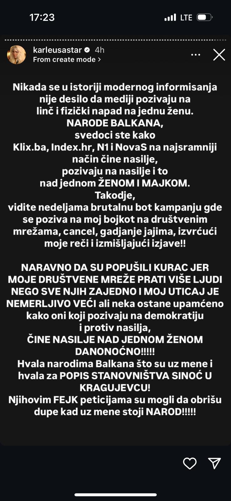 “Nikada se u istoriji modernog informisanja nije desilo da mediji pozivaju na line i fizicki napad na jednu zenu. Vidite nedeljama brutalnu bot kampanju gde se poziva na moj bojkot na drustvenim mrežama, cancel, gadjanje jajima, izvrcu moje reci i izmisjajuci izjave!! NARAVNO DA SU POPUSILI K*RAC JER MOJE DRUSTVENE MREZE PRATI VISE LJUDI NEGO SVE NJIH ZAJEDNO I MOJ UTICAJ JE NEMERLJIVO VECI ali neka ostane upamceno, kako oni koji pozivaju na demokratiju i protiv nasilja, CINE NASILJE NAD JEDNOM ZENOM DANONOCNO!!!!! Hvala narodima Balkana sto su uz mene i hvala za POPIS STANOVNISTVA SINOC U KRAGUJEVCU! Njihovim FEJK peticijama su mogli da obrisu dupe kad uz mene stoji NAROD!!!!!”, zaključila je pevačica.