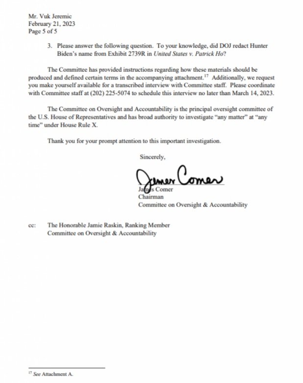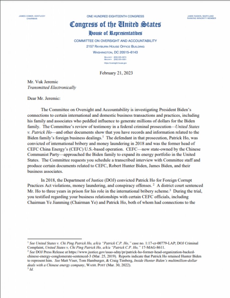 Nadzorni odbor Predstavničkog doma pod vođstvom republikanaca nastavio je u utorak istragu poslova porodice Bajden, i poslali su pismo predsedniku Narodne stranke Vuku Jeremiću kojim je zatražena dokumentaciju o njegovim vezama sa Hanterom Bajdenom.