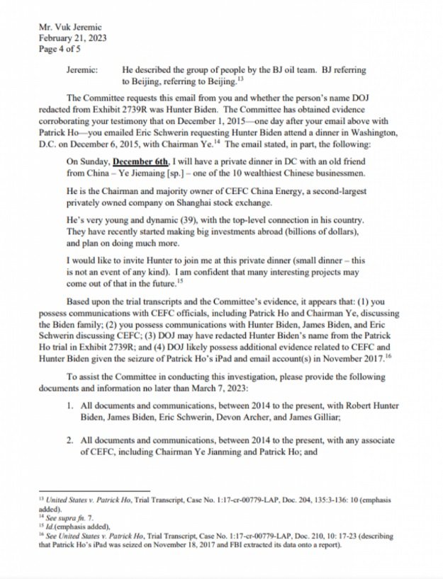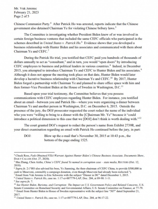Pismo se odnosi na slučaj Patrika Hoa, bivšeg direktora kineske energetske kompanije koji je osuđen za kršenje Zakona o korupciji 2018. Jeremić je svedočio tokom suđenja Hou i rekao da ga je energetska kompanija platila kao konsultanta i da je pokušao da predstavi različite pojedince Hanteru Bajdenu.