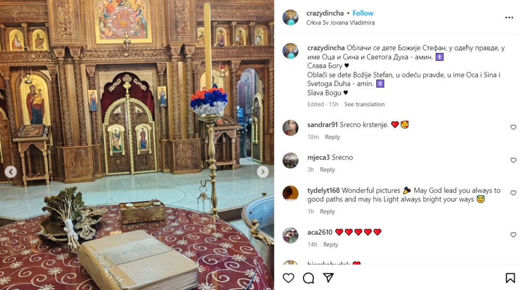 Svečani verski obred održan je u crkvi Svetog Jovana Vladimira u Beogradu, a ovaj poseban trenutak pevač je podelio sa svojim pratiocima na Instagramu.
