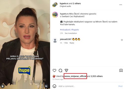 Vesna Zmijanac lajkovala objavu Foto Screenshot Instagram/hypetv.rs