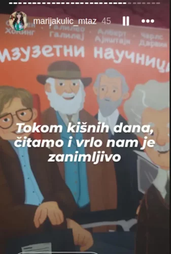 –Tokom kišnih dana čitamo i vrlo nam je fino – napisala je Marija preko slike na kojoj su Stiven Hoking, Galileo Galilej, Stiven Hoking i Čarls Darvin jednom prilikom.
