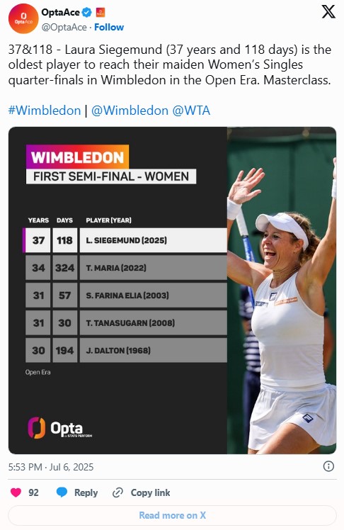 Trenutno 104. na WTA listi tako je nadmašila rekord koji je do sada držala njena sunarodnica Tatjana Marija, koja je 2022. godine izborila četvrtfinale sa 35 godina i 324 dana.