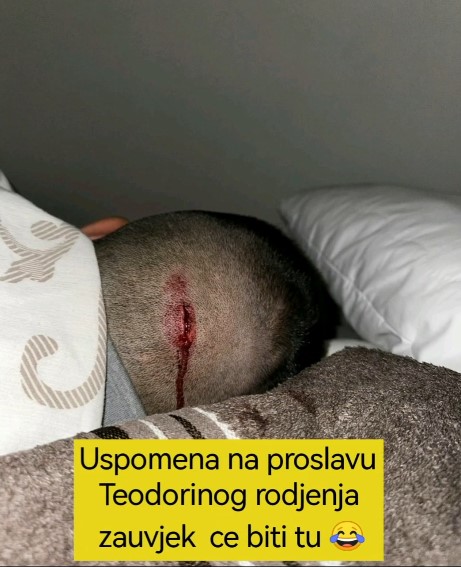 Potom je pokazao i „uspomenu“ na ovu veče, ogromnu ranu na glavi.