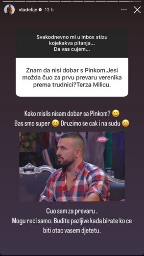 Na sledeće pitanje „Jesi li možda čuo za prevaru verenika prema trudnici? On je odgovorio: Kako misliš nisam dobar sa televizijom? Baš smo super, družimo se čak na sudu. Čuo sam za prevaru. Mogu reći samo pazite koga birate za oca svog deteta“ -odbrusio je Vladimir.