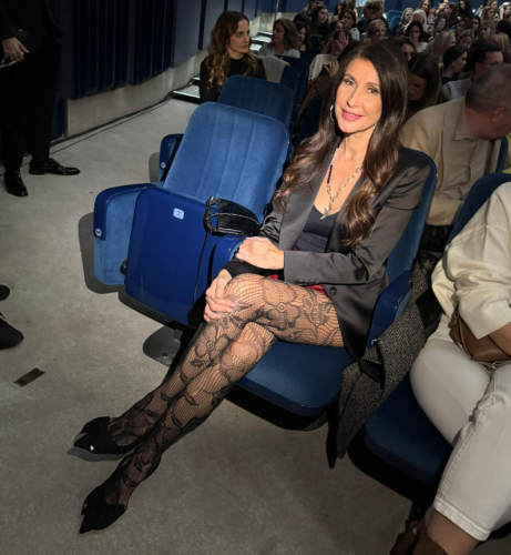 Voditeljka je odabrala sofisticirani crni komplet, elegantni sako uparen sa kratkom suknjom, dok su mrežaste čarape sa upečatljivim cvetnim dezenom i crne salonke sa mašnicom dodatno istakle njen besprekoran stil i vitku figuru.