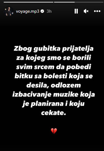 – Zbog gubitka prijatelja za kojeg smo se borili svim srcem da pobedi bitku sa bolešću koja ga je zadesila, odlažem izbacivanje muzike koja je planirana i koju čekate – napisao je Mihajlo uz emotikon slomljenog srca.