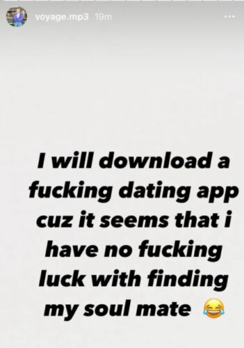 Naime, Vojaž se svojim pratiocima na društvenoj mreži Instagram požalio kako nema sreće u ljubavi, te da je kap izgleda prelila čašu, pa će reper sreću potražiti na aplikacijama za upoznavanje.