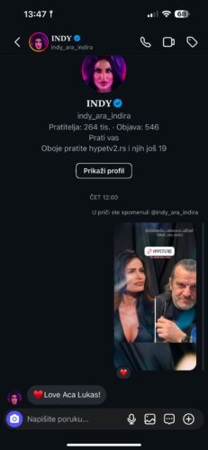 Nakon Acinog odgovora koji je bio i više neko šmekerski, Indi se ponovo oglasila, te je našem zvaničnom Instagram nalogu poslala poruku nadovezavši se na Acino oglašavanje: Love Aca Lukas!