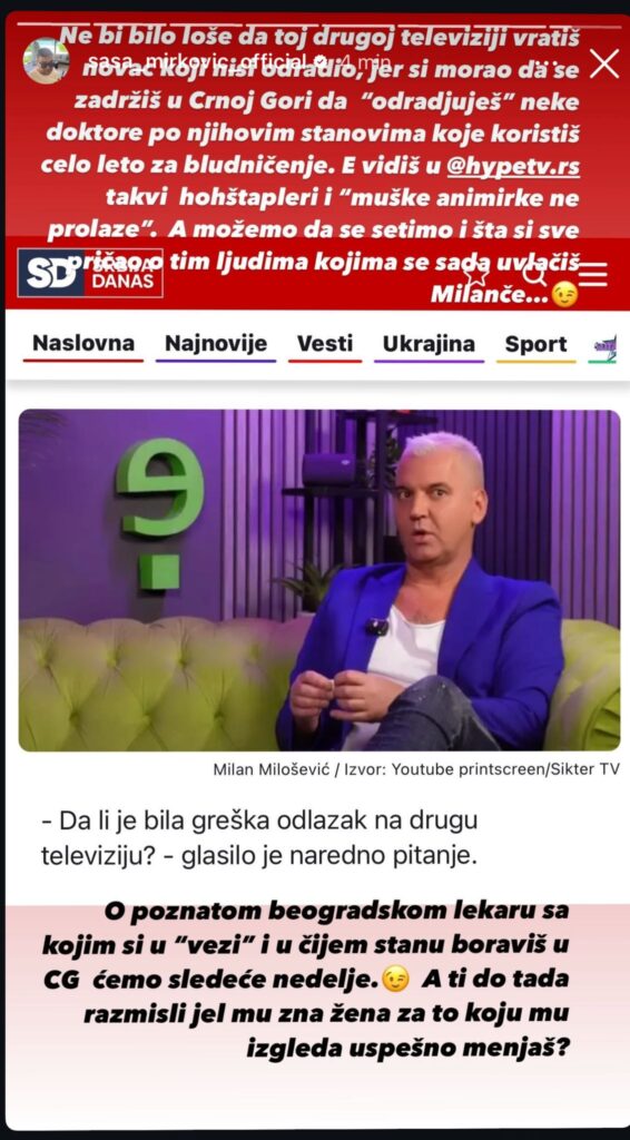 Reading: „Vrati televiziji novac“! Saša Mirković brutalno RASKRINKAO Milana Miloševića nakon izjave da mu je Hype greška u karijeri: „O lekaru kome uspešno menjaš ženu ćemo DRUGI PUT“