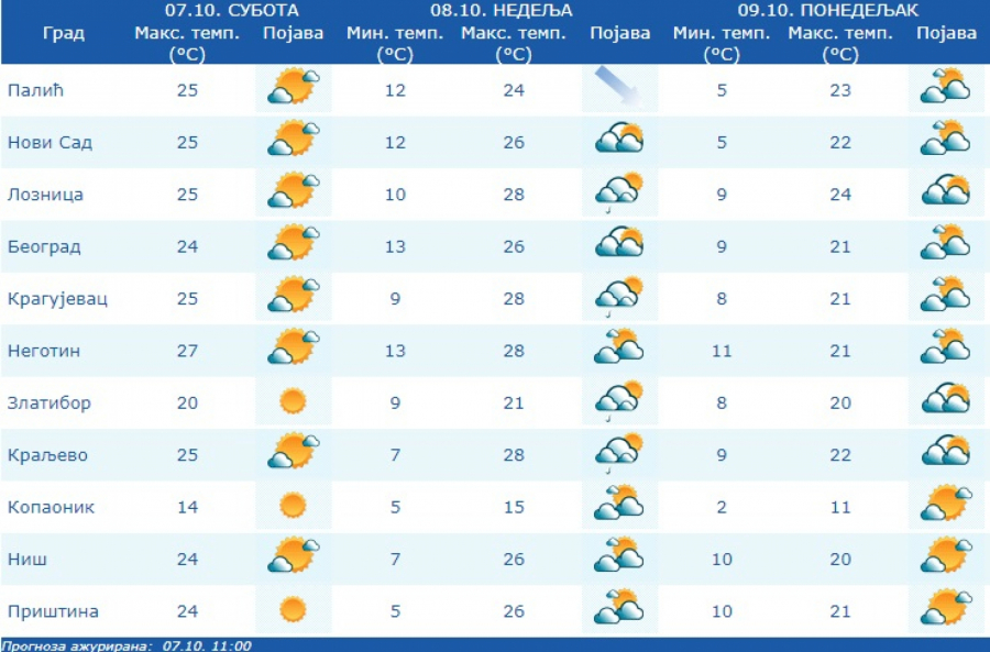 Najniža temperatura od 10 do 13 °C, a najviša oko 26 °C. Prema prognozi za narednih sedam dana, u Srbiji se očekuju hladna jutra, po kotlinama i dolinama reka jugozapadne i južne Srbije i kratkotrajna magla.