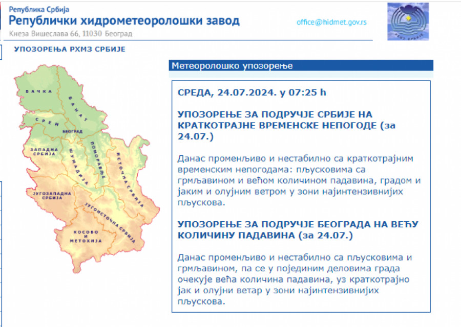 Republički hidrometeorološki zavod Srbije izdao je upozorenje u 07: 25 časova jutros! I to zbog kratkotrajnih vremenskih nepogoda danas.