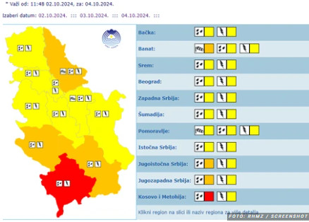 Već u petak u celoj zemlji biće upaljeni meteoalarmi, a zbog velike količine padavina koja se očekuje na Kosovu i Metohiji, na ovoj teritoriji na snazi će biti crveni meteoalarm.
