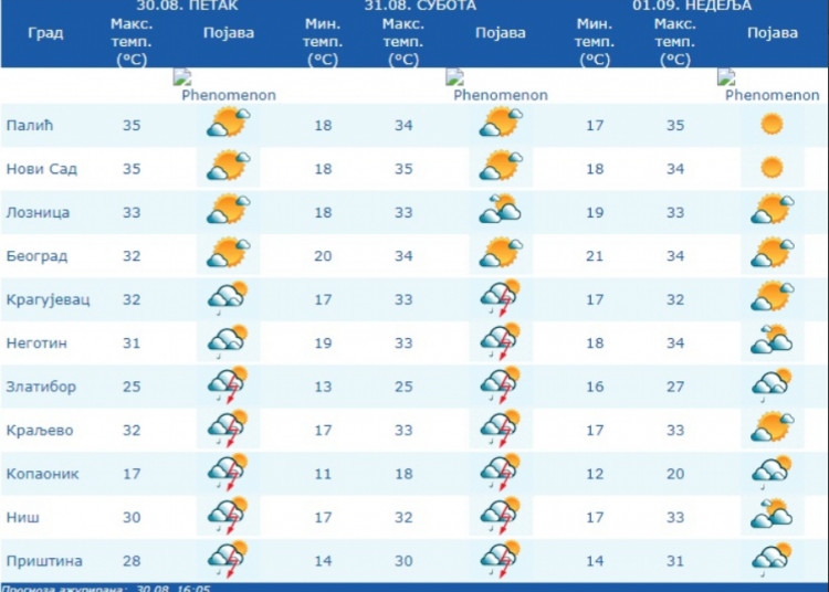 Sredinom dana i posle podne, uz lokalni razvoj oblačnosti, kratkotrajni pljuskovi i grmljavina biće češći na istoku i jugu Srbije, kao i u planinskim predelima, ali se retko mogu javiti i u ostatku zemlje.